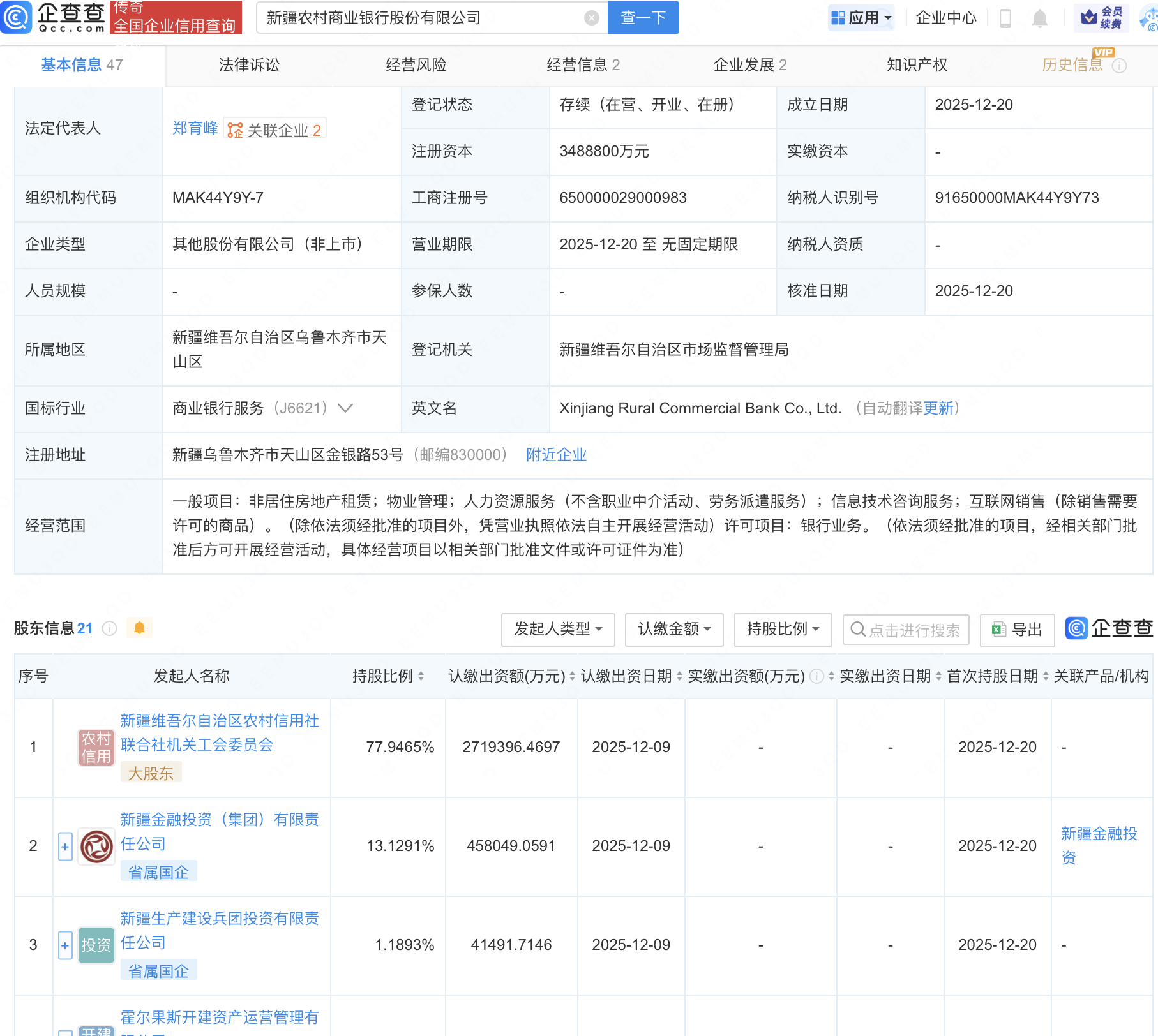 近日,新疆农村商业银行股份有限公司成立,注册资本348.88亿元,经营范围包含:非居住房地产租赁;物业管理;银行业务等。企查查股权穿透显示,该公司由新疆维吾尔自治区农村信用社联合社机关工会委员会、新疆金融投资(集团)有限责任公司、新疆生产建设兵团投资有限责任公司等共同持股。